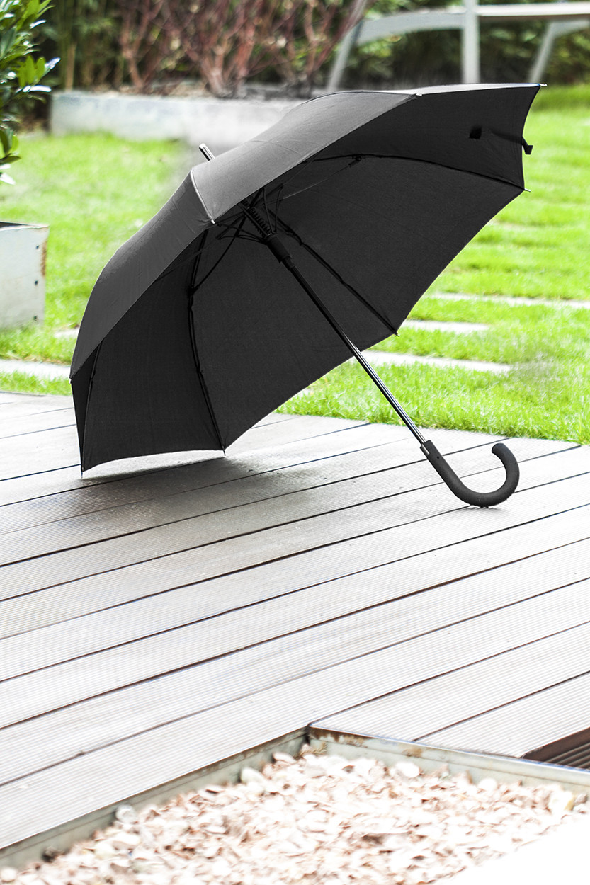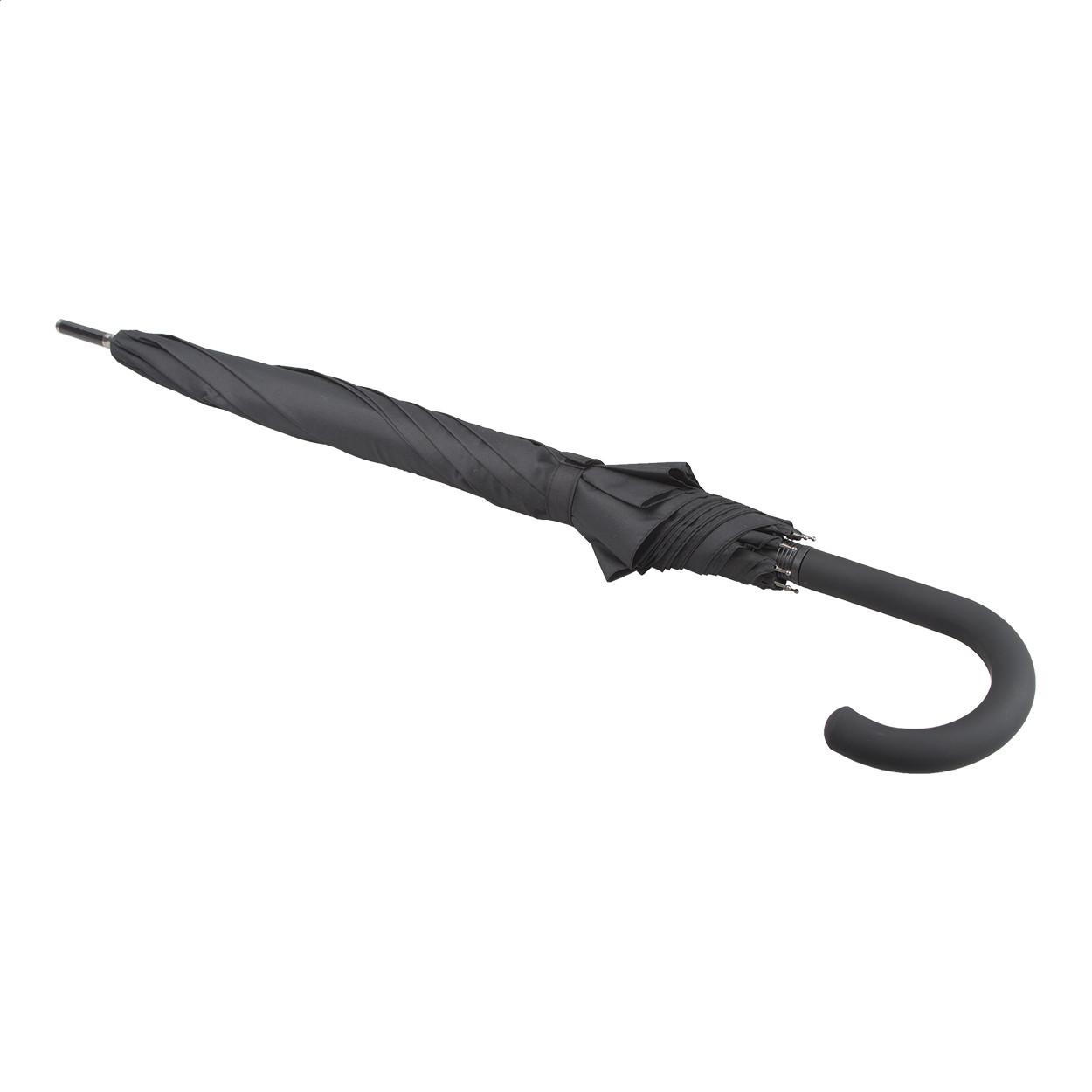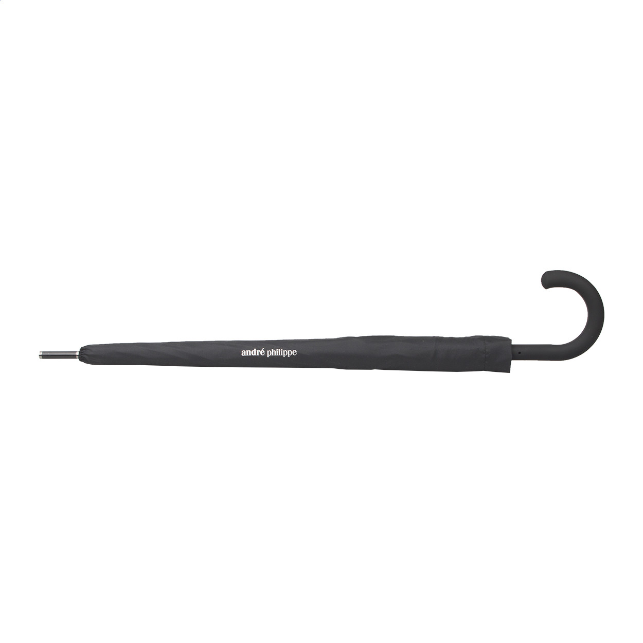 8 paneles, szélálló, automata esernyő, márkajelzéssel ellátott tokban. Gumírozott fogantyúval, fém nyéllel és üvegszálas vázzal. Anyaga: 190T pongee. André Philippe márkatermék.