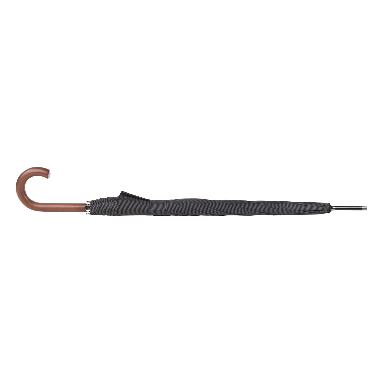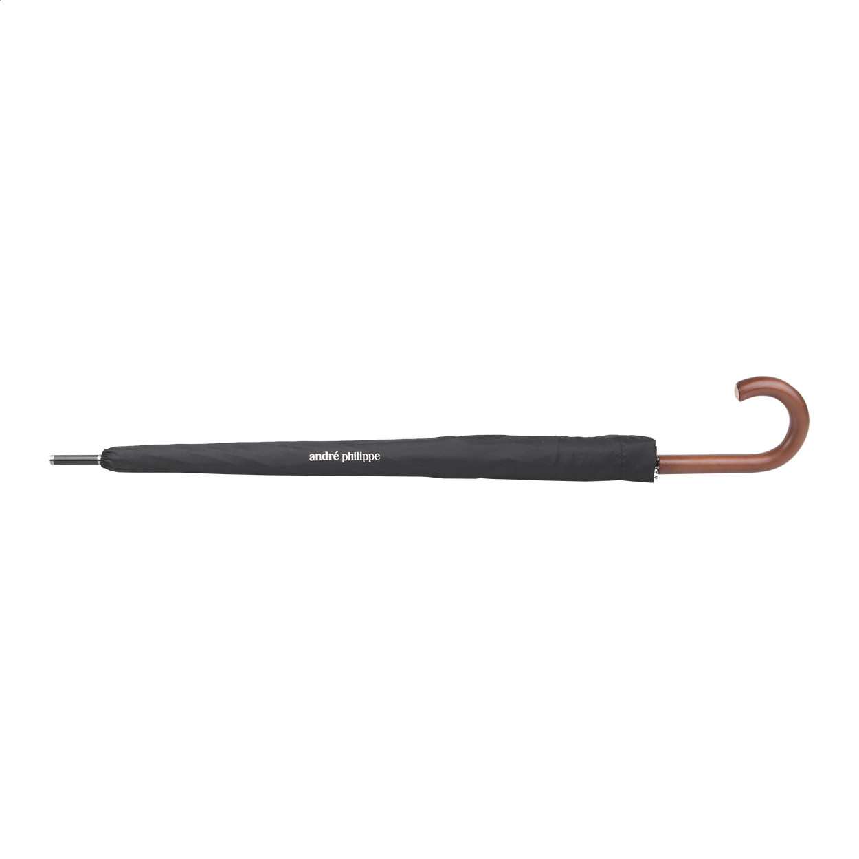 Automata, szélálló, 8 paneles, fekete-szürke csíkos esernyő fa fogantyúval, fém nyéllel és üvegszálas vázzal. Márkajelzéssel ellátott tokban szállítjuk. André Philippe márkatermék. Anyaga: 190T pongee.