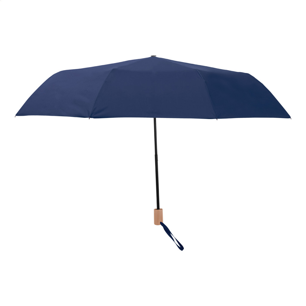 Összecsukható, szélálló 8 paneles esernyő színben megegyező tokkal. Fém vázzal, üvegszálas merevítőkkel és fa fogantyúval. 190T RPET pongee anyagból. Megkülönböztető RPET címkével.