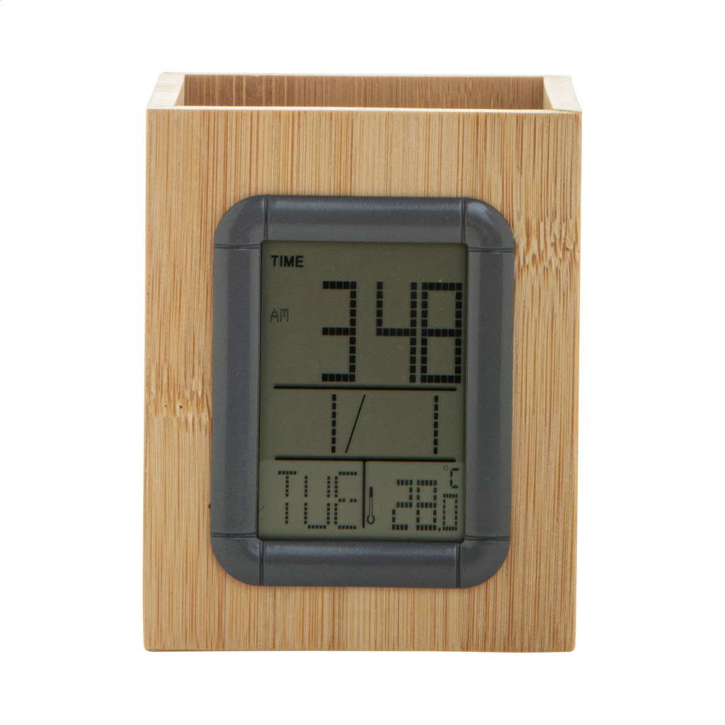 Bambusz tolltartó multifunkciós digitális órával. Funkciók: ébresztőóra, naptár, hőmérő. Gombelemmel szállítjuk.