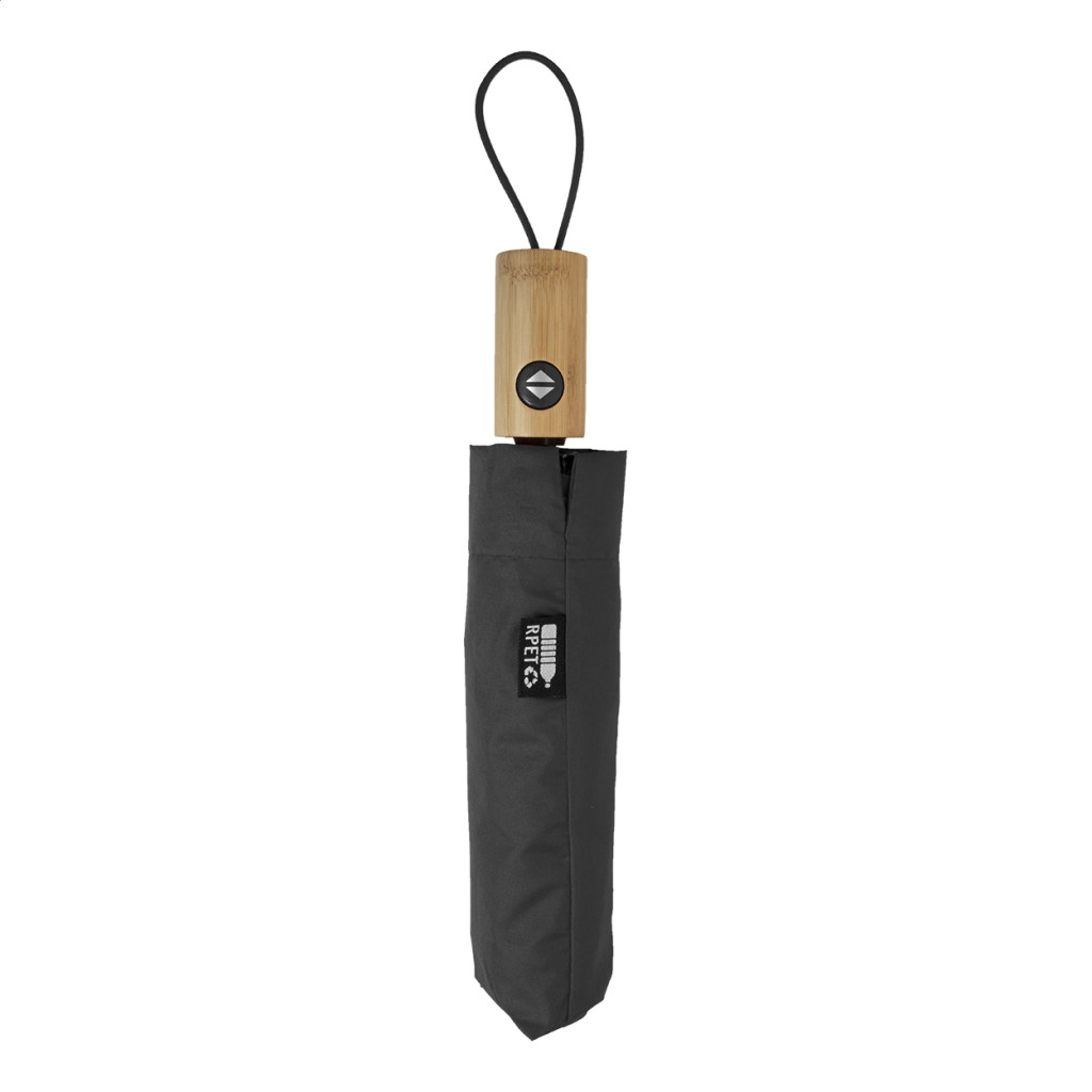 Automata (nyitás/zárás), szélálló, összecsukható esernyő 8 panellel, színben megegyező tasakban. Fém kerettel, üvegszálas vázzal és bordázattal és bambusz fogantyúval. 190T RPET pongee. Megkülönböztető RPET címkével.
