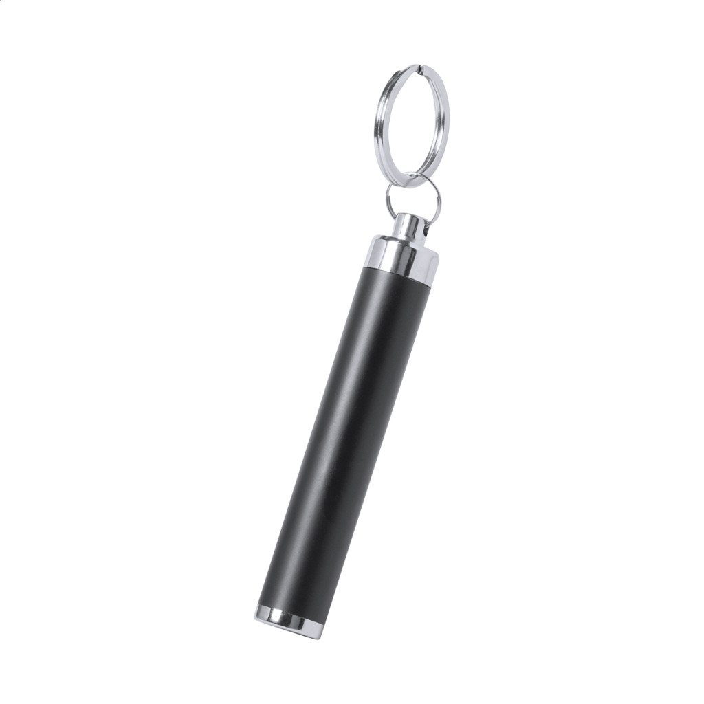 Műanyag elemlámpa 1 LED fénnyel, kulcskarikával. A gravírozott embléma világít. Gombelemmel szállítjuk.