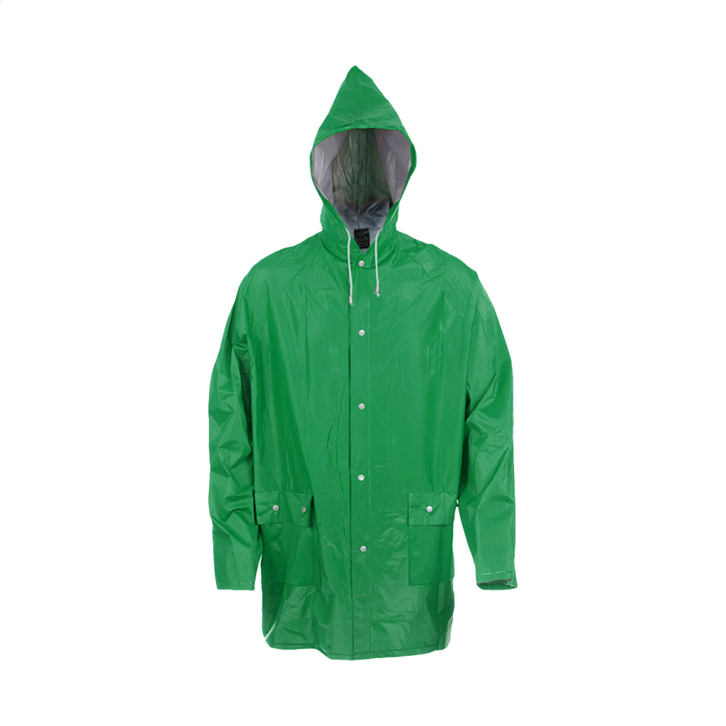 Kapucnis esőkabát ellenálló PVC anyagból, hőtartó bevonattal és két első zsebbel. Patenttal zárható.