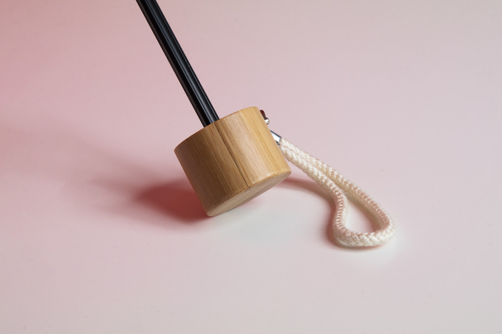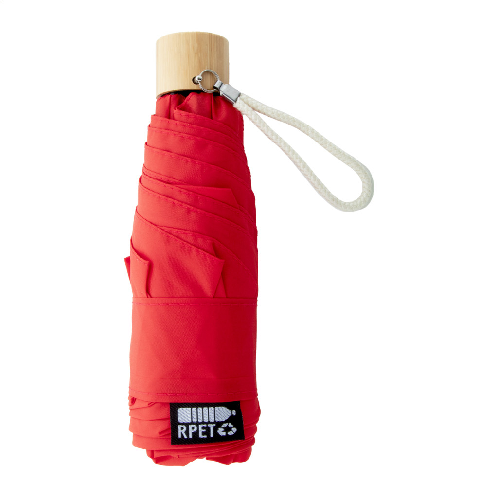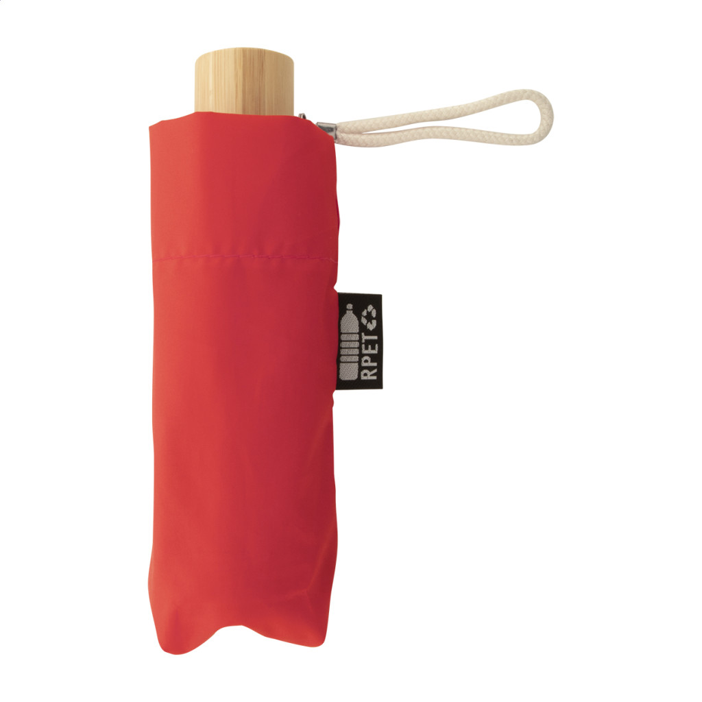 Manuális, szélálló, 3 helyen behajtható RPET mini esernyő 6 panellel, megegyező színű tasakban. Fém kerettel, üvegszálas bordákkal, bambusz fogantyúval és pamut pánttal. 190T RPET pongee. Megkülönböztető RPET címkével.