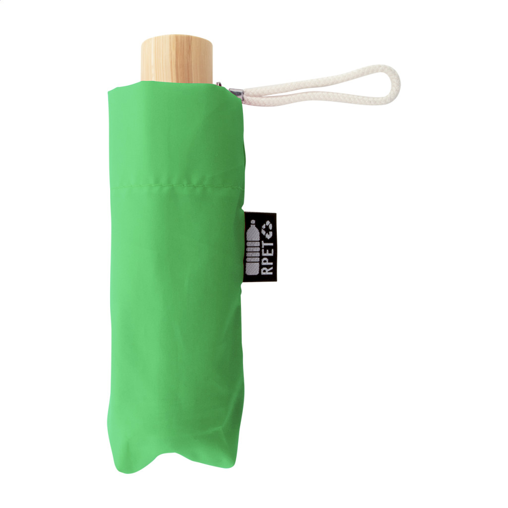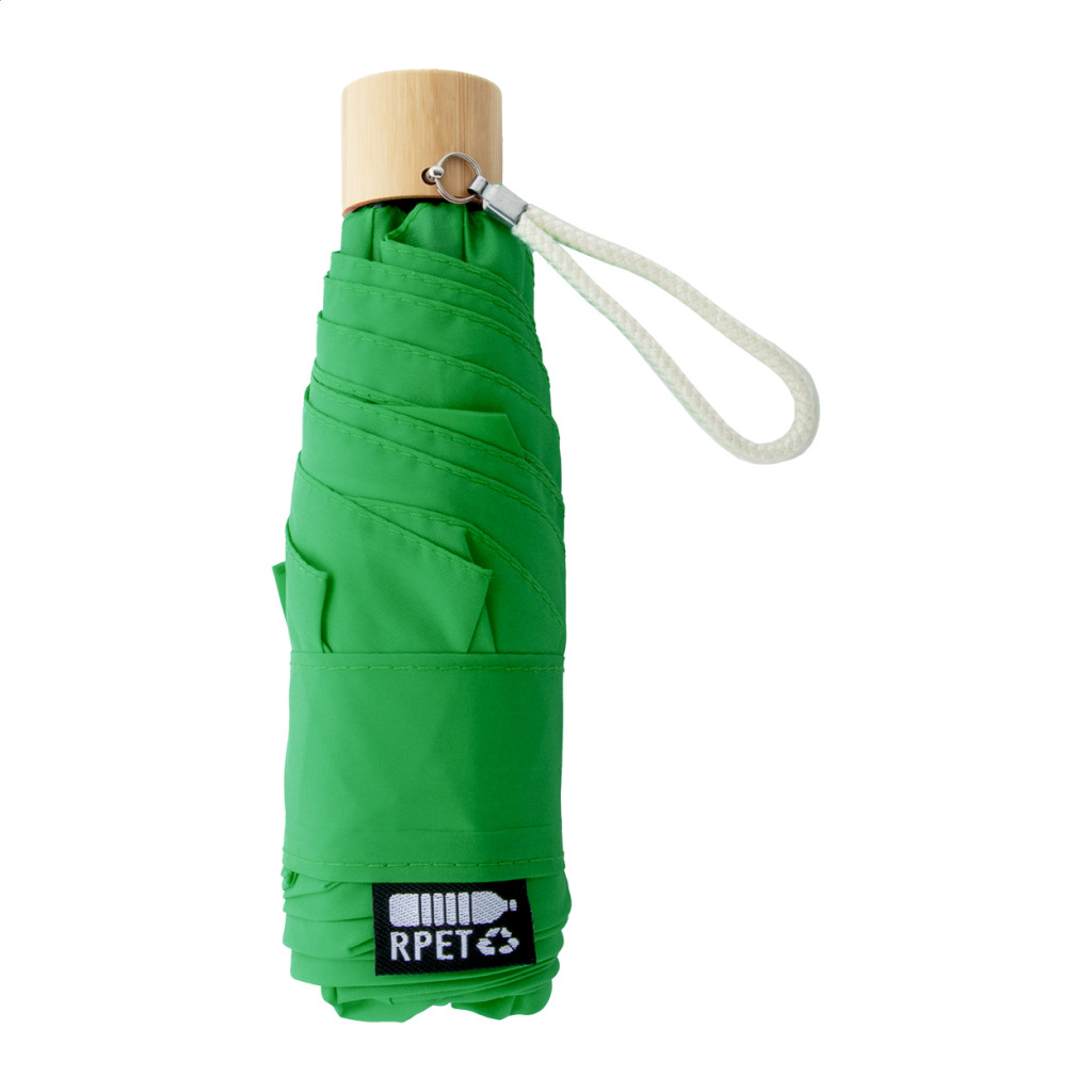 Manuális, szélálló, 3 helyen behajtható RPET mini esernyő 6 panellel, megegyező színű tasakban. Fém kerettel, üvegszálas bordákkal, bambusz fogantyúval és pamut pánttal. 190T RPET pongee. Megkülönböztető RPET címkével.