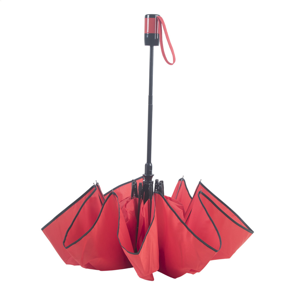 8 paneles szélálló, mindkét irányban automata esernyő fém vázzal, valamint fém és üvegszálas merevítőkkel. Színével egyező csuklópánttal és tokkal. Anyaga: 190T pongee.