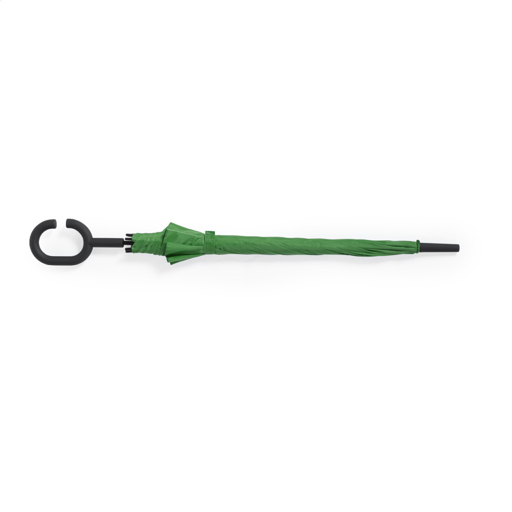 8 paneles, automata szélálló esernyő, a végén gumírozott karpánttal, fém véggel és nyéllel, üvegszálas bordázattal. A végén karra rögzíthető funkcióval. 170T pongee.