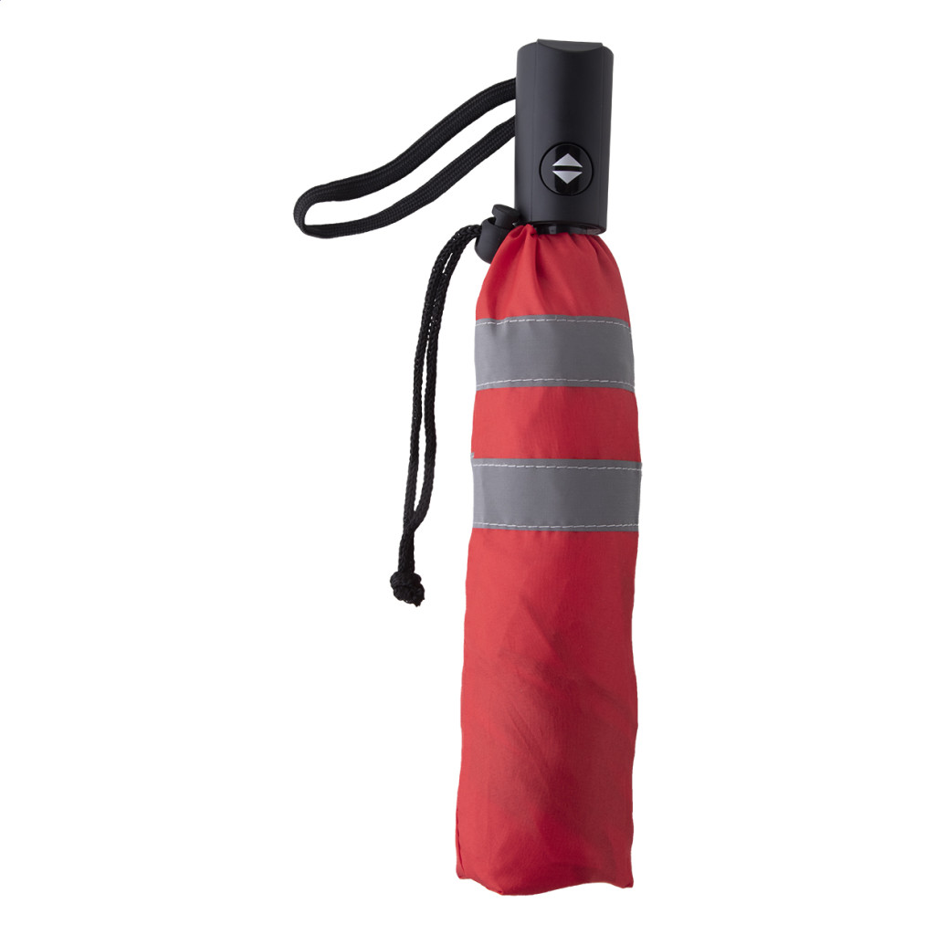 Teljesen automata (nyitás/csukás) 8 paneles, szélálló, összecsukható esernyő fényvisszaverő szegéllyel. Fém nyéllel, alumínium vázzal, üvegszálas merevítőkkel és műanyag fogantyúval. Azonos színű, fényvisszaverő csíkokkal díszített tartóban. Anyaga: 190T pongee. A termék kizárólag promóciós célra alkalmas, nem minősül egyéni védőfelszerelésnek.