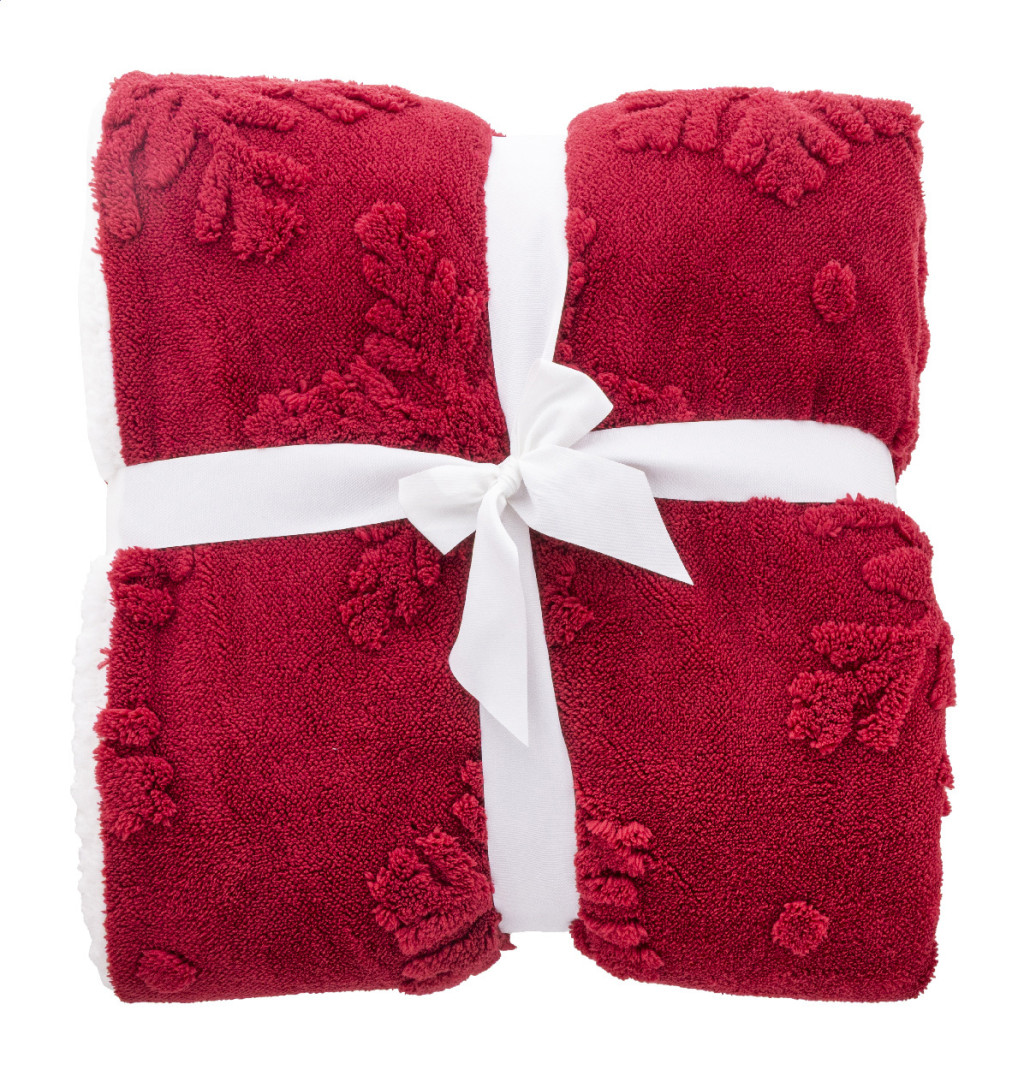 Luxus, kétrétegű RPET karácsonyi takaró jacquard hópehely mintával. 260 g/m² RPET korall polár és megfordítható 210 g/m² RPET sherpa polár béléssel. Szalaggal és nyomtatható papírkártyával csomagolva.