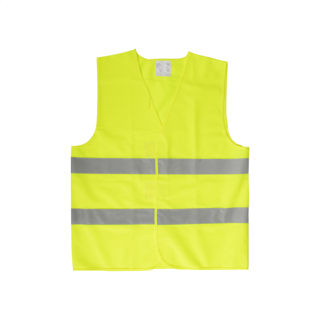 Jól láthatósági mellény gyerekeknek, poliészter. Megfelel az európai EN17353-es norma magasfokú láthatóságra tervezett biztonsági előírásának.